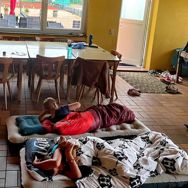 Abends unternahm das Aufsichtsteam Alessa, Wolfgang und Ellen eine Nachtwanderung, bevor die Kinder im Clubhaus (ebenfalls wetterbedingt statt Zelt) erschöpft auf ihren Matratzen einschliefen. Die Nachtwanderung ließ aufgrund der gruseligen Stimmung so manches Mundwerk kleiner werden. Nach einem gemeinsamen Frühstück gab es für die 5 Übernachtungskinder am Freitag noch eine ausgiebige, abschließende Tenniseinheit.