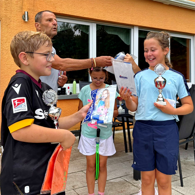 Neben gezielten Übungen zur Technik (Grundschläge, Volley und Aufschlag) und Koordination standen auch spannende Spiele und am letzten Tag ein kleines Einzelturnier auf dem Plan. So lernten die Kinder nicht nur die Grundlagen des Tennissports weiter kennen, sondern konnten diese am Ende in die Praxis umsetzen. Alle Kinder erhielten für die Teilnahme neben einem Pokal noch tolle Sachpreise.